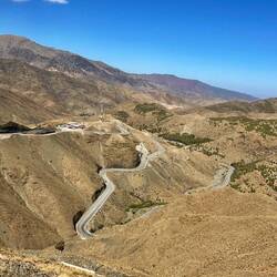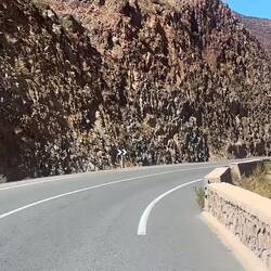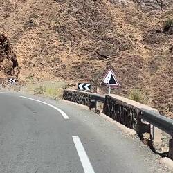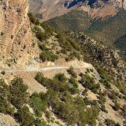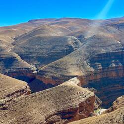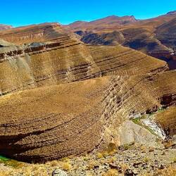 Unsere Fahrt startet in Ouaouizaght, führt uns über Tilougguite nach Amezray. Wir werden Non-Stop von einer atemberaubenden Berglandschaft begleitet, welche von unzähligen Tälern tief zerklüftet ist. Die Strasse ist erstaunlicherweise gut ausgebaut, nur 27 km Gravel und eine trockene Flussbettdurchfahrt unterbrechen unseren Fahrkomfort (Kurven und Salven bleiben eine Selbstverständlichkeit) Wir fahren weiter durchs Aint Bouguemez.