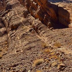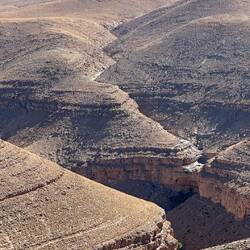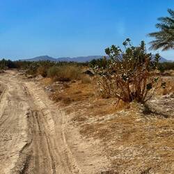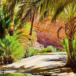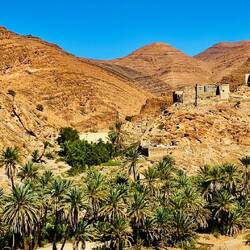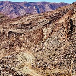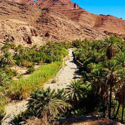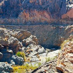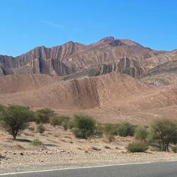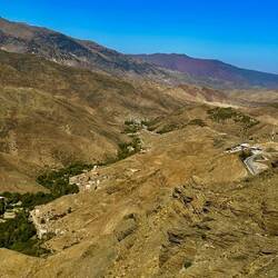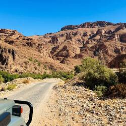 Schroffe Berge mit tiefen Einschnitten und loses Geröll kleiden den Taleinschnitt. Dazwischen ab und an Bäume und Büsche, eine ideale Farbkombination. Doch dann endlich überwiegt das Grün, und wir erreichen das Tal mit seinen Dattelpalmen. Ein Einstieg in den „Dschungel“ mit blendender Ansicht.