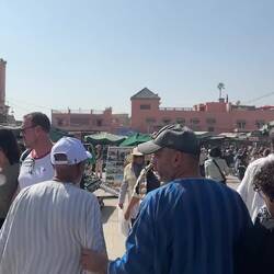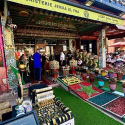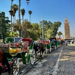 Im Herzen der Medina liegt nahe dieser Moschee der Platz „Djemaa el-Fna“ – der Platz der Gehenkten. Er war früher eine Hinrichtungsstätte. Die Köpfe der Opfer wurden zeitweise auf Pfählen aufgespiesst und zur Schau gestellt. Heute bietet er ein Sammelsurium an Schaustellern, kleinen Restaurants und Marktständen. Henna-Künstlerinnen sitzen am Boden und bemalen Hände und Füsse von Touristinnen, und Künstler, Wahrsager sowie Schlangenbeschwörer bieten sich als Fotomotiv an. Und: mitten drin, eine Grossbaustelle: Der Platz wird seit März 2025 umgebaut. Das Projekt soll die Infrastruktur modernisieren und den Platz mit historischen Materialien neu pflastern, Grünflächen sollen angelegt werden, sowie Bereiche für Freizeitaktivitäten.