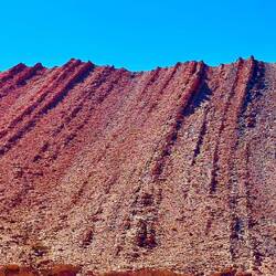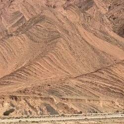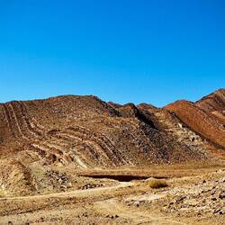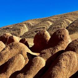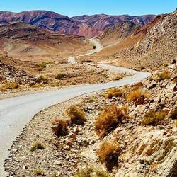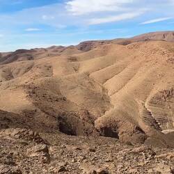 Wir fahren über die NR 7 Richtung Südwesten weiter und machen dann einen Umweg über die RR 106 und RR 104 nach Tafaout. Diese Schlaufe durch den Antiatlas lohnt sich unbedingt. Sie führt uns durch eine malerisch Landschaft. Hier ist die Natur der beste Künstler. Durch die Tektonik aufgeschobener Sedementschichten ergibt sich eine willkürliche Dynamik ins Landschaftsbild. Am Hintergrund heben sich über 2000 Meter hohe Berge in dunklen Grautönen ab.