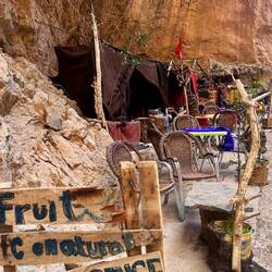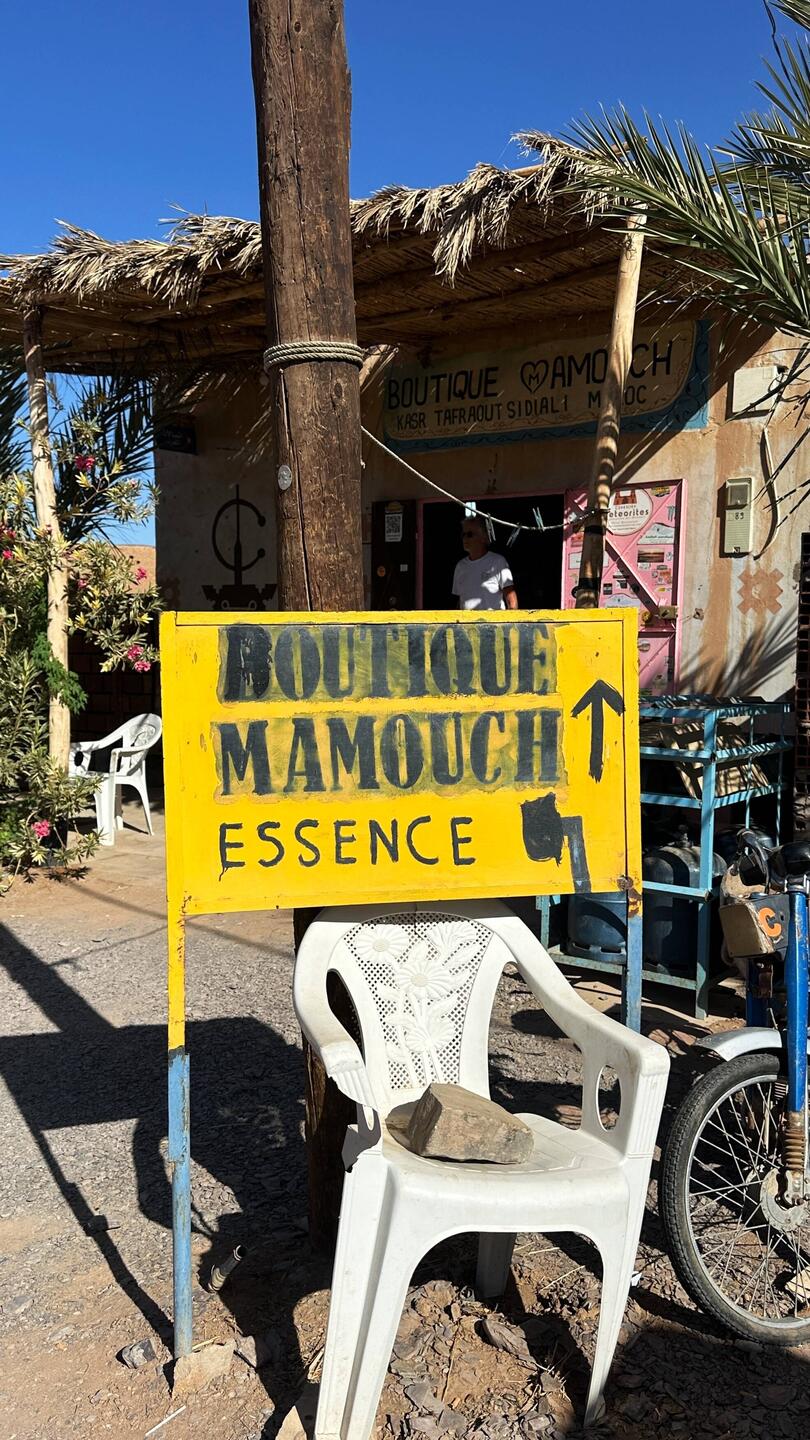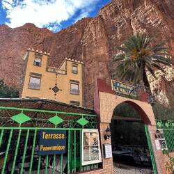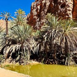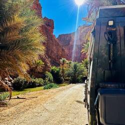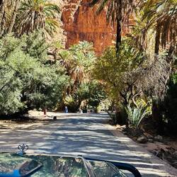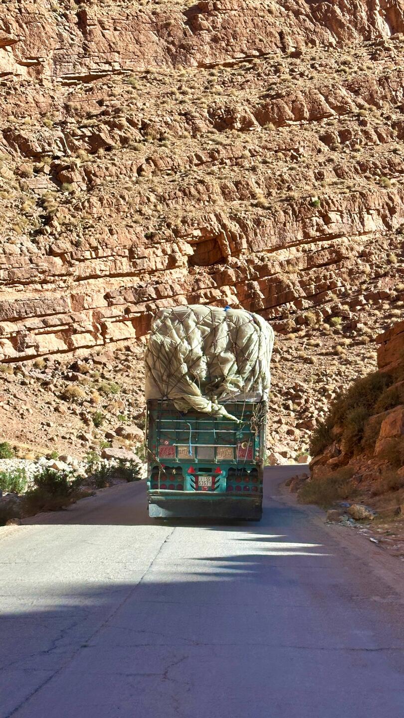 Ich mag dieses Tal und finde es die schönste Schlucht bis anhin in Marokko. Sie ist schmal und dementsprechend ist die Strasse eng und sehr abwechslungsreich, da der Fluss immer wieder „die Richtung wechselt“ und die Route kreuzt (oder umgekehrt). Der Pflanzenwuchs dazwischen ist wild und ungezähmt, selten und nur ganz am Rand wird etwas zurück gestutzt, Natur pur und kein (Park-) Platz für Touristen. Wir finden ein kleines Kaffee für einen kurzen Stopp. Unser Fahrzeug pferchen wir aus Platzgründen eng an eine Palme, um die schmale Durchfahrt zu gewährleisten.