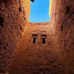 Icht, Ischt oder Taschelhit, ist eine aus einem alten Ksar und einem neuen Ortsteil bestehende Oasensiedlung mit etwa 1500 Einwohnern im Westen der Provinz Tata in der Region Souss-Massa. Nach einem Tagine-Abendessen und einer ruhigen Nacht, starten wir frisch in dem Morgen und besuchen mit Abdellah sein Dorf. Er führt uns in den Untergrund des 500-jährigen Ksar, wo immer noch zwei Familien wohnen. Im Sommer brennt die Sonne hier mit 50 Grad vom Himmel. Im Ksar, welcher nur aus Erde, Palmenholz und Palmenblätter gebaut ist, soll es dann doch etwas erträglicher sein. Er zeigt uns den Zugang des ausgeklügelten, unterirdischen Wassersystems. Weiter geht es mit der Stirnlampe auf dem Kopf in den dunklen und verlassenen Ksar. Durch ein Labyrinth gelangen wir in die ehemalige Wohnung seines Grossvaters: Das Untergeschoss für ihn, das erste Geschoss für die 1. Frau, das zweite Geschoss für die 2. Frau. Ähnlich, wie in einem Riad, kommt das Licht durch die Öffnung im Innenhof. Hier gibt es aber weder Pool, noch Möbel, noch Teppiche. Alles ist aus getrocknetem Lehm konstruiert, kleine Nischen zum Schlafen, alles dunkel. Ich würde hier depressiv werden (erst recht als 2. oder 3. Frau).