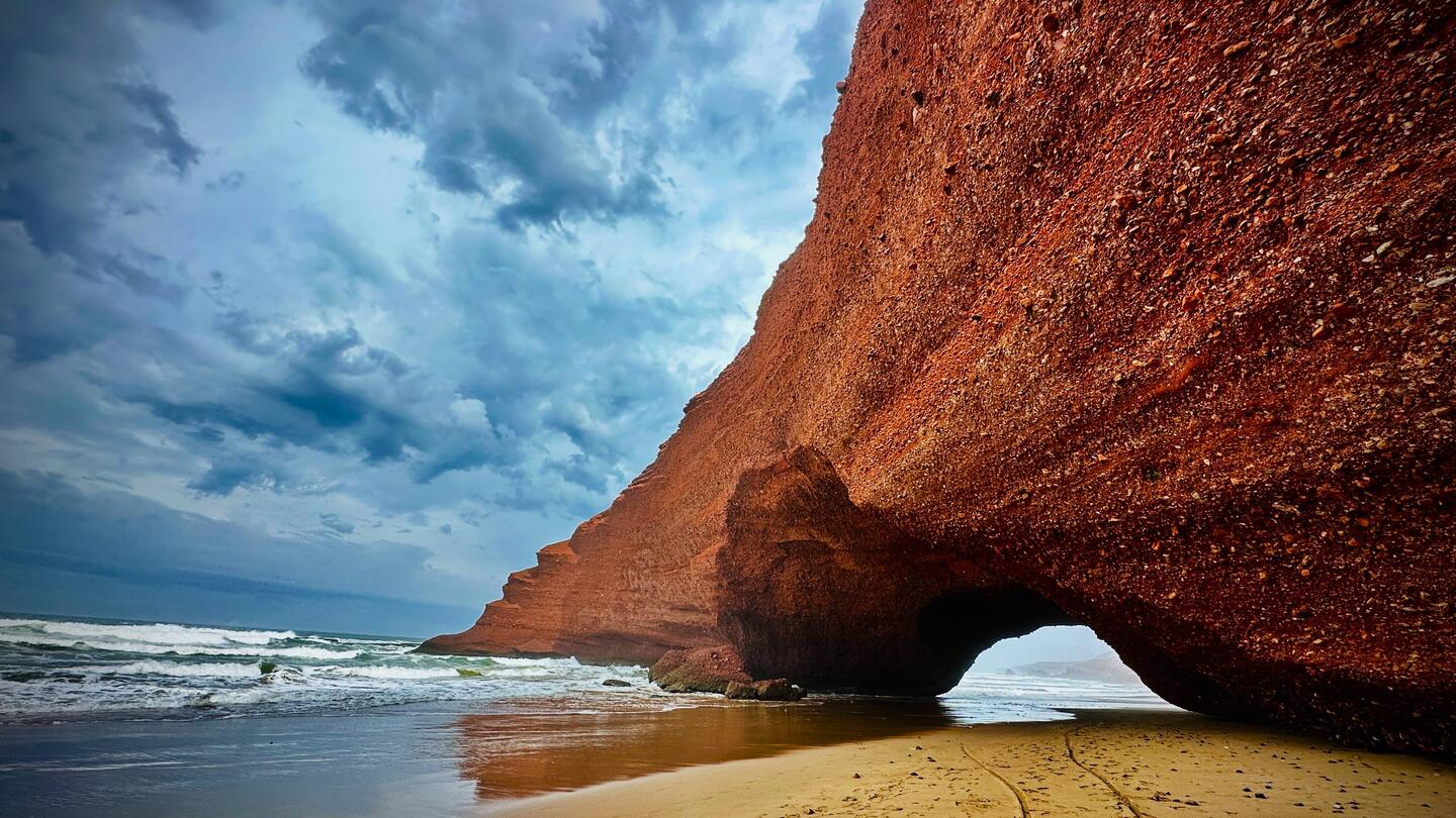 Heute gehört das zweite, grosse Steintor immer noch zu den Highlights an Marokkos Küste. Das Steintor am südmarokkanischen Atlantik bildet mit seinen umliegenden Felsformationen ein unvergessliches Panorama im Licht. Leider versteckt sich die Sonne hinter einem Schlechtwettertief, so lohnt es sich für uns nicht, die Abendsonne am Legzira Beach abzuwarten.