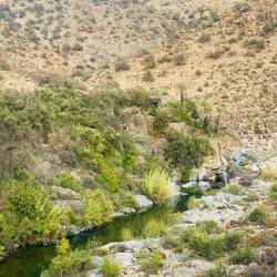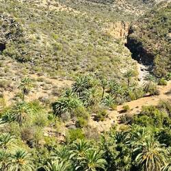 Schroffe Berge mit tiefen Einschnitten und loses Geröll kleiden den Taleinschnitt. Dazwischen ab und an Bäume und Büsche, eine ideale Farbkombination. Doch dann endlich überwiegt das Grün, und wir erreichen das Tal mit seinen Dattelpalmen. Ein Einstieg in den „Dschungel“ mit blendender Ansicht.