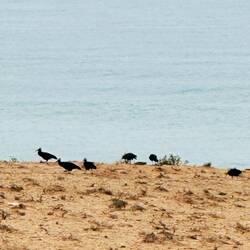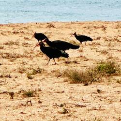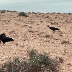 Für den gefiederten Gesellen fahren wir nochmals 50 km südlicher in de Park, nach Sidi Tabat, wo wir uns sagen lassen müssen, dass der Waldrapp in nördlicher Richtung, in der Nähe von Douira gesichtet wurde, das deckt sich denn auch mit den aktuellsten Angaben von Cris und Ruedi, die uns eben ein Update via Whatsapp geschickt haben. Also los, direkt über die Küstensandstrasse. Und plötzlich erblicken wir eine Vogelkolonie über unseren Köpfen, charakteristisch, die typischen Ibisschnäbel. Gleich vor uns setzt sich der Schwarm von ca. 200 Tieren ab, um im Schreitmarsch zur Nahrungsaufnahme überzugehen und das direkt vor unseren Augen. Was für ein Glück!