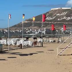 Agadir ist auch bekannt für seine langen Strände, dem ganzjährig angenehmen Klima und für seine Rolle als beliebten Badeort. Obwohl der heutige Wind doch schon sehr heftig ist und die Liegestühle leer bleiben.