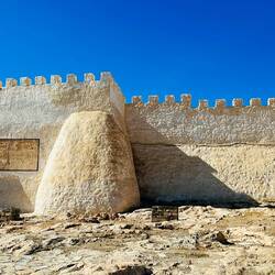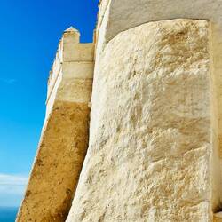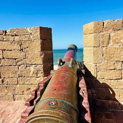 Spannend ist auch die Skala de la Ville. Hier laufen wir über den Wehrgang mit Blick auf die vorgelagerte Insel Mogador. Wenn das Meer unruhig ist, schlagen die Wellen direkt an die Felsen unterhalb der Mauern.