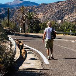 Begleitet werden wir von einer Hundegang, bestehend aus sieben Mitgliedern. Sie folgen uns, überholen uns, um dann wieder auf uns zu warten. Ein tolles Rudel! Wir überqueren zwei Taleinschnitte und erreichen dann das Dörfchen Tgahrt Ankrym. Hier folgen wir der Strasse, bis es dann wieder hinunter in die Schlucht geht. Da treffen wir auf ein marokkanisches Picknick. Anders, als bei uns, werden wir sofort dazu eingeladen. Die Grossfamilie, bestehend aus Brüdern, Ehefrauen und Kindern in jedem Alter sind natürlich sehr neugierig. Für einmal wollen sie uns fotografieren, so lustig, wir werden also