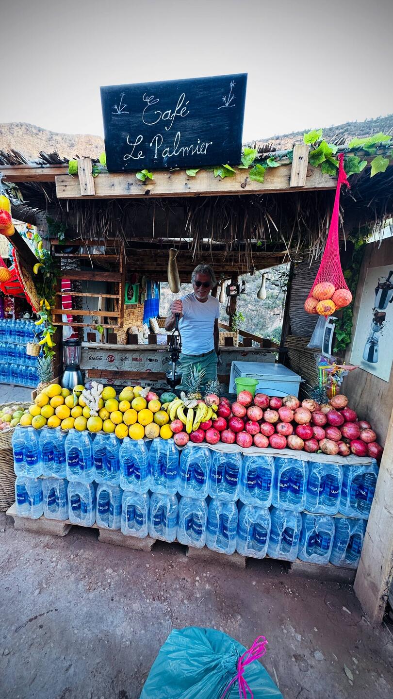 Ich mag dieses Tal und finde es die schönste Schlucht bis anhin in Marokko. Sie ist schmal und dementsprechend ist die Strasse eng und sehr abwechslungsreich, da der Fluss immer wieder „die Richtung wechselt“ und die Route kreuzt (oder umgekehrt). Der Pflanzenwuchs dazwischen ist wild und ungezähmt, selten und nur ganz am Rand wird etwas zurück gestutzt, Natur pur und kein (Park-) Platz für Touristen. Wir finden ein kleines Kaffee für einen kurzen Stopp. Unser Fahrzeug pferchen wir aus Platzgründen eng an eine Palme, um die schmale Durchfahrt zu gewährleisten.