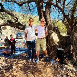 zur Attraktion. Sie wollen uns mit Couscous vom Holzfeuer verköstigen. Wir bleiben aber bei Tee und selbst gebackenem Kuchen. Nach der Fotosession verabschieden wir uns mit „shukran und bslana“. Leider sind nachher unsere Hunde weg, immerhin haben sie uns 8 km begleitet. Zurück an unserem Ausgangspunkt bestellen wir Tagine und Spaghetti (ich hatte einfach Lust darauf).