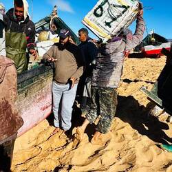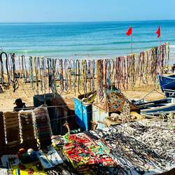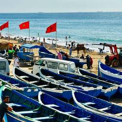 Die Fischerboote in Imsouane liegen teilweise an Land, weil sie auf Ebbe warten, um zur See zu fahren, oder weil sie in der Bucht vor den Wellen geschützt werden müssen. Der Hafen ist ein reiner Fischerhafen, und die Boote sind ein wichtiger Teil der lokalen Kultur und Wirtschaft.