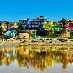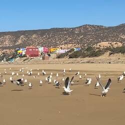 Aghroud, das Amazigh-Dorf mit dem Beinamen „Dorf der schönen Farben“, liegt zwischen den Ortschaften Taghazout und Ait Tamer, 36 km nördlich von Agadir, der Hauptstadt der Amazigh von Souss. Wir treffen auf goldenen Sand unter unseren Füssen, eine Lagune vor unseren Füssen und ein paar Surfer und Möven am Horizont. Wie entspannt hier alles ist. Eine wunderschöne Gegend, die ein Besuch wert ist.