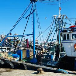 Am Hafen von Essaouira brechen die hohen Wellen, hier fliegen tausende Möwen umher und warten darauf, dass die Fischer mit ihren blauen Booten zurückkehren und ihren Fang ausladen. Der Hafen von Essaouira ist noch heute ein wichtiger Handelsplatz des Landes. Hier werden Boote gebaut und gepflegt, Fischernetze verteilt und fangfrischer Fisch verkauft.