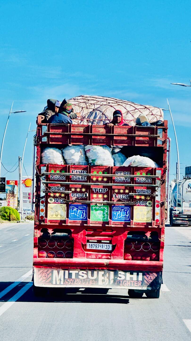 Heute bekommen wir Besuch von Janique und Michi aus Zürich. Janique ist die Tochter einer Freundin von uns. Sie machen auch eine Marokko-Rundreise und führen anscheinend für spätere Reisen noch mehr im Schilde. Leider reicht es nur für ein Mittagessen, trotzdem cool, haben sich unsere Reisewege hier gekreuzt. Am Nachmittag hängen wir noch etwas in Zagora ab. Es ist nicht viel los; wir fühlen uns als alleinige Touristen unter all den feilschenden Verkäufern. Plötzlich geht ein Hupkonzert los! Gefolgt von einer Karawane. Nein, keine Dromedare, sondern Autos, gefüllt mit ganzen Familien! Eine fröhliche Kundgebung. Wir sind praktisch die einzigen, die den Umzug flankieren. Alle winken uns fröhlich zu, als wären wir UN-Delegierte.
