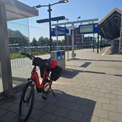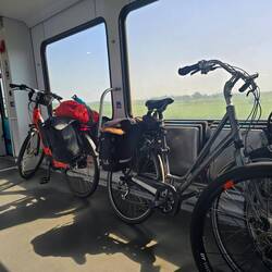 De fiets in de trein gaat voorspoedig, behalve dat hij bij de stop in Veenwouden omvalt. Niet goed neergezet dus.