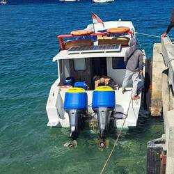 Treffpunkt um 6:00 am Hafen, nach 10 wartenden Minuten kamen die beiden völlig verpennt. Verpflegung haben sie mitgebracht , OrangenLeggi altro