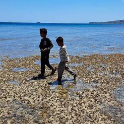 Erster Strand Spaziergang. Es gibt schon einen großen Gezeitenunterschied, bei Ebbe ist es fast unmöglich ins Wasser zu kommen. Ich hab dann immer meine Flossen benutzt um über die Steine undLeggi altro