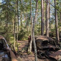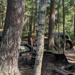 Allemaal oude autowrakken midden in de natuur, temidden van de fluitende vogels in een zweeds bos. Heel apart!