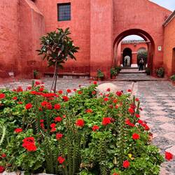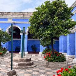 Nach dem Frühstück trafen wir unseren neuen Guide, Yudy. Mit ihr machten wir eine Stadtführung, sie erzählte uns wirklich viel über die Geschichte der Stadt, aber irgendwann konnten wir ihr gar nicht mehr folgen. Auch baten wir sie anfangs, uns zu einem Geldautomaten und zum Wasser kaufen zu bringen. Aber irgendwie spulte sie erstmal ihr Programm ab. Wir besuchten die Basilica Cathedral de Arequipa, welche am Plaza de Armas eine ganze Seite einnimmt. Anschließend gingen wir zu einem der größten Märkte im Süden Perus, dem Mercado San Camilo, dessen Überdachung vom Ingenieur Gustavo Eiffel konstruiert und 1938 eingeweiht wurde. Während Renate, Thomas, Wolfram und Sigi den Markt besuchten, gingen wir mit Annette und Franz in ein Café im Claustros de La Compañia, wo Sören und Annette einen „Infusion“ (Tee) gegen Magenverstimmung und Franz und ich einen Kaffee bekamen. Wir besichtigten anschließend dieses Jesuitenkloster. Im Inneren des Tempels sind geschnitzte, mit Blattgold bedeckte Altarbilder aus Holz zu sehen. In der Sakristei befindet sich die Kapelle San Ignacio mit polychromen Wandgemälden, die tropische Flora und Fauna zeigen . Der Kreuzgang wurde im 18. Jahrhundert erbaut.