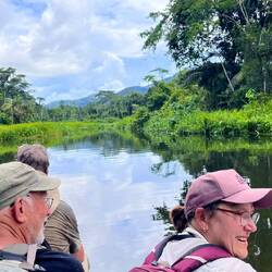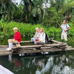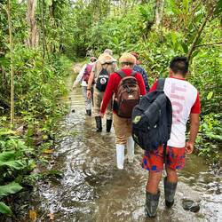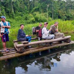 Wieder eine Dreiviertelstunde zurück im tropischen Regenwald- das ist wahrlich nicht mein Klima! Die „Brühe“ läuft so schnell und man ist völlig fertig. Mit den Gummistiefeln über große unförmige Steine zu laufen, macht die Sache nicht einfacher. Mir taten so die Füße weh! Renate tat auch einen unbedachten Schritt - und landete im Schlamm🤭…