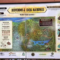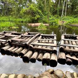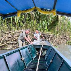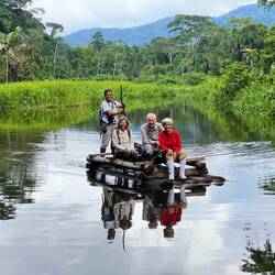 Nachdem wir alle zusammen in der Lodge gefrühstückt haben, ging ein kleiner Teil nochmals eine Stunde auf Tierbeobachtung. Man konnte z.B. Tapirspuren sehen und Spuren eines Gürteltiers. Am Nachmittag gegen 14 Uhr machten wir die eigentlich für vormittags noch geplante Tour zu einem Lagunensee, der dadurch entstand, als der Fluss Rio Madre de Dios seinen Weg änderte. Auf dem Weg zum Boot sahen wir noch ein paar Eichhörnchenaffen. Ca. 15 min Bootfahrt entfernt erlangten wir unser Ziel. Vom Ufer des Flusses wanderten wir ca. 45 Minuten über Steine, durch Wasserläufe und Urwald zum See, wo wir mit Floßen über den See schipperten. Von einem 15 m hohen Aussichtsturm ließen sich Camungos (Hornwehrvögel) und Hoatzine (Stinkybirds) beobachten. Erstere geben unheimlich laute Rufe von sich 🤭. Der Hoatzin (Opisthocomus hoazin), auch Schopfhuhn, Zigeunerhuhn oder Stinkvogel genannt, ist eine Vogelart, dessen Verwandtschaft völlig ungeklärt ist und wird meistens einer eigenen Familie und Ordnung zugeordnet. Von allen anderen Vögeln unterscheidet sich der Hoatzin durch sein an Wiederkäuer erinnerndes Verdauungssystem. Der Hornwehrvogel ist ein großer, hühnerartig wirkender Vogel mit ziemlich hohen Beinen und einer komischen „Antenne“ auf dem Kopf 🤭. Er erreicht ausgewachsen eine Körperlänge von 84 Zentimetern und wiegt dann zwischen zwei und drei Kilogramm. Interessant!
