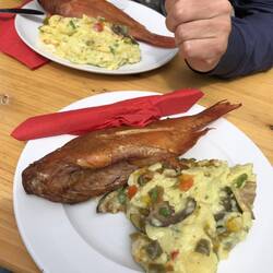 Halb 8 war die Nacht rum und nach dem Duschen frühstückten wir diesmal im Bistro. Das Angebot war gut. Zwei Brötchen mit Frühstücksei, Wurst, Käse und Marmelade sowie Saft plus zwei Tassen Czytaj więcej