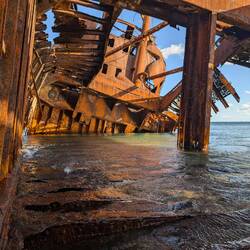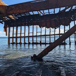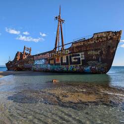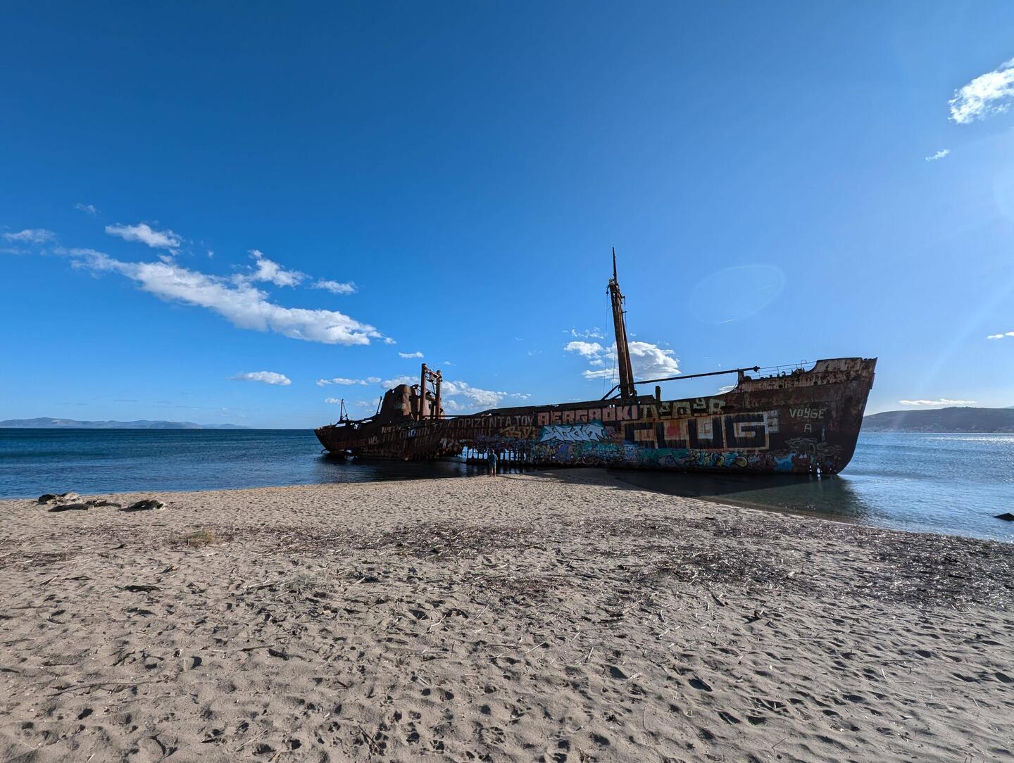 Gestrandet sind nicht wir, sondern ein Schiff vor etwas mehr als 40 Jahren. Wir bestaunen das Dimitrios Schiffswrack das auf einem beinahe perfekten Sandstrand auf Grund gelaufen ist. Schon aus weiterLeggi altro