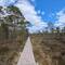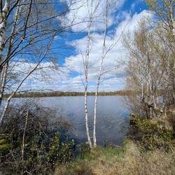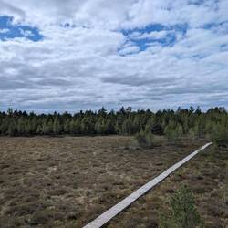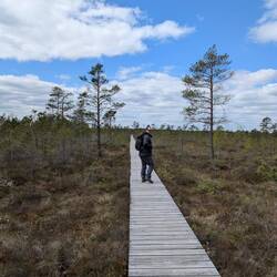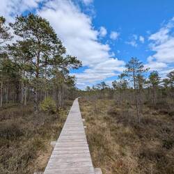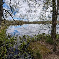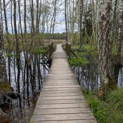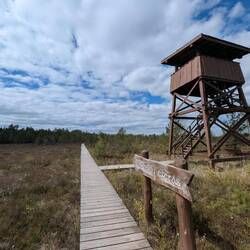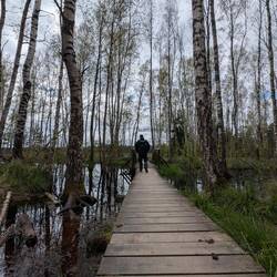 Aus dunklem Moorwasser wachsen grüne Grasbüschel und schlanke weisse Birken empor - wie Geister aus dem Dunklennass. Ein schmaler Holzsteg führt knapp über die stille Fläche & scheint zuMeer informatie