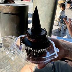 Danach gab es noch was zu naschen. Keine Schoko-Frösche, keine Bertie Botts Bohnen (auch wenn es beides gab), sondern einen magischen Lolli und einen Hexenhut-Cupcake.