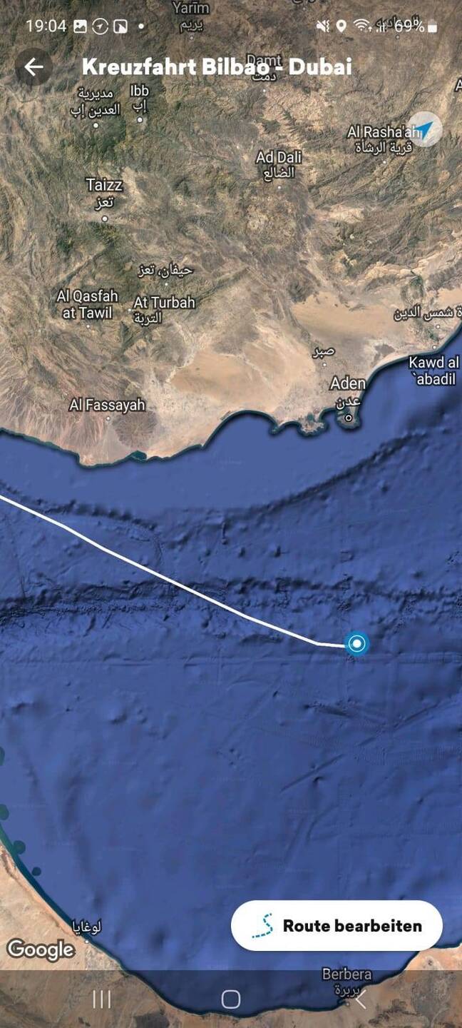 Kreuzfahrt Bilbao - DubaiShow tripAdd to bucket listRemove from bucket listShareDay 18Wednesday, November 15, 2023 at 6:00 PM 🌬 29 °C Altitude: Sea level Golf von Aden11.866397, 44.94398311°51’59” N 44°56’38” ESüdlichster Punkt der Reise vor Jemen November 15, 2023, Golf von Aden ⋅ 🌬 29 °C 2 likes Show trip