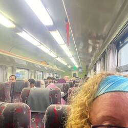 Eventually the heat got too much and we found uncomfortable seats under a fan. I passed the time doing some work. Eventually the call for a train came. What an unusual procedure. We scanned through a ticket barrier and sat in a waiting area, a few metres from where we’d been waiting for 4 hours. I looked around wondering where we would board. After a while, a lady held up a sign saying‘follow me’ so we followed her, through the station, down an escalator, to another ticket gate. Here she left us and we had to find the platform, down escalators. Eventually we got there. The train came and we boarded easily.