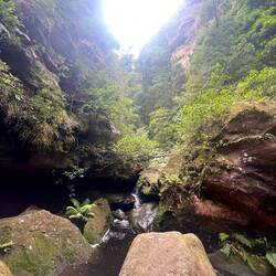 Glen made us breakfast and we set off at 9am. We drove back to where we were last evening and parked up. We then set off down into the valley. Down and down. As we descended the plants changed and became green, more like NZ plants. We walked along the valley, under water falls and over stepping stones. We saw some Yabbies. After a while we started to walk back up. Up and up. At the top Glen and I went back to the car while the others walked back.