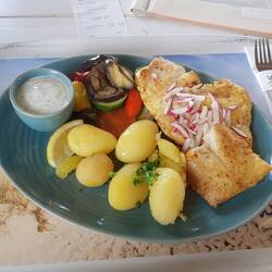 Da es regnete haben wir die Chance genutz, trocken zu sitzen und was zu Mittag zu futtern. Im Friesenjung. Sehr lecker und auch günstig