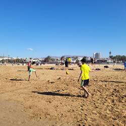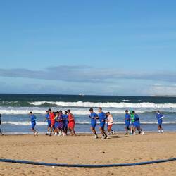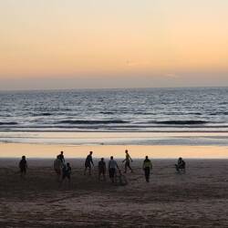Am Strand sind viele Einheimische unterwegs- genießen das Wasser und spielen Fußball.