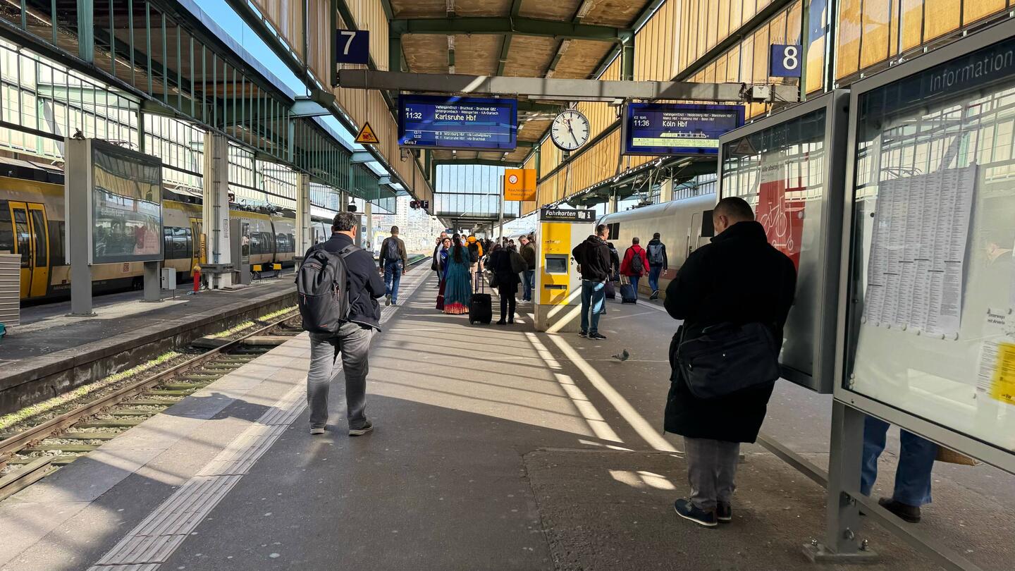 Warten auf RE1 nach Bruchsal auf Gleis 7.
