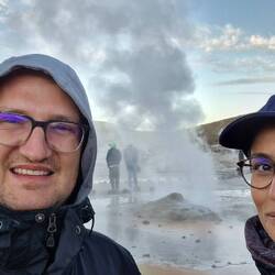 Zirveye ulaştığımızda, üçüncü arabaydık ve bu nedenle alana ilk girenlerden biriydik. Hava hala zifiri karanlıktı ve ay kraterin kenarından yeni yükselmişti. Ilk gayzerlerin önünde durmaya başlamıştık bile. Burada yaklaşık 3,5 saat geçirdik ve neredeyse donarak ölüyorduk, hava -5°C idi. Sabah 9.00'dan kısa bir süre önce güneş kraterin kenarına ulaştı ve her şeyi altın ve sıcak ışığıyla yıkadı 🥳.