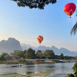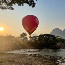 Après une matinée de travail comme d'habitude et un après-midi de découverte des environs de Vang Vieng, nous admirons le coucher de soleil sur ces monts karstiques et la rivière Nam Song,Læs mere