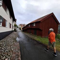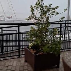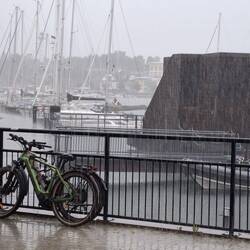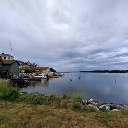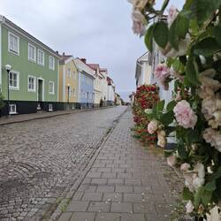 Off the train and a short walk to board Whisper at Slotsholmmen Marina , the sun shining - all looking good. Our first night on board and a local explore and provisioning. An early night after a delicious meal and the obligatory Swedish meatballs for Ronney 😋 . Our plans were to move on but weather and the need to purchase a few essential bits led to another night in this lovely city. The bromptons came out for the 4km ride to the larger boat supplies where we purchased a further 'yellow pages' sized guide of the 376 harbours oh and some rope of course. The sudden change in weather with impressive lightening & thunderstorm kept us local with a light supper and an evening stroll along the beautiful rose lined pavements and coloured wooden clad houses. The 'concrete seals' that block cars from open walk ways are much friendlier than barriers with their cute smiles.