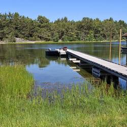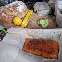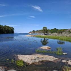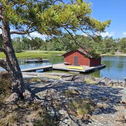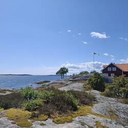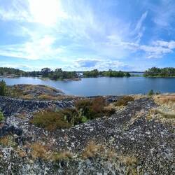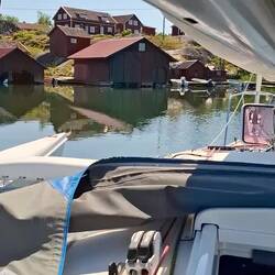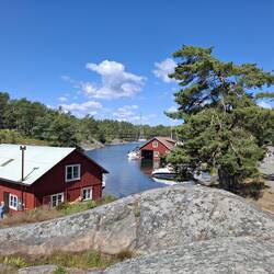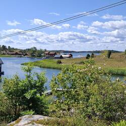 We enjoyed a leisurely walk around the island with such beautiful scenery at every inlet . The gneiss & granite rocks are impressive and the clusters of 'falu red' ( originating from the Falun copper mines) wood clad buildings built around them to form perfect natural patios. Wild meadows and wooded pathways leading back to the quayside where the smoked salmon,still warm, was just ready to serve. That was lunch sorted back on board!