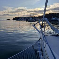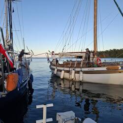It was a fairly long motor sail arriving in beautiful sunshine . We were guided to a suitable spot behind a Polish boat and spon after a beautiful old wood boat came alongside them. We shared our stories and the different waters we've all sailed. Such friendly people.