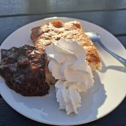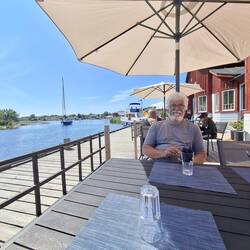 The stroll ashore to pay the mooring fees in the bar led to a quick drink before supper ashore too as we soaked up the warmth of the early evening sun. The special platters of beef and fish respectively for the captain and I were great and the Åland pancakes with prune sauce and cream - a regional speciality we thought we'd give a go. Not the usual pancake more of a baked pancake or custard made from cooked semolina, baked with flour, eggs and flavoured with cardamom. It's not really my thing but we gave it a try!