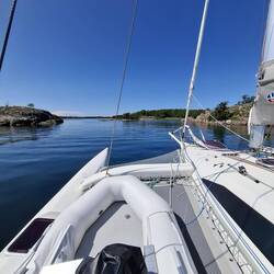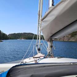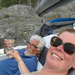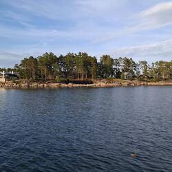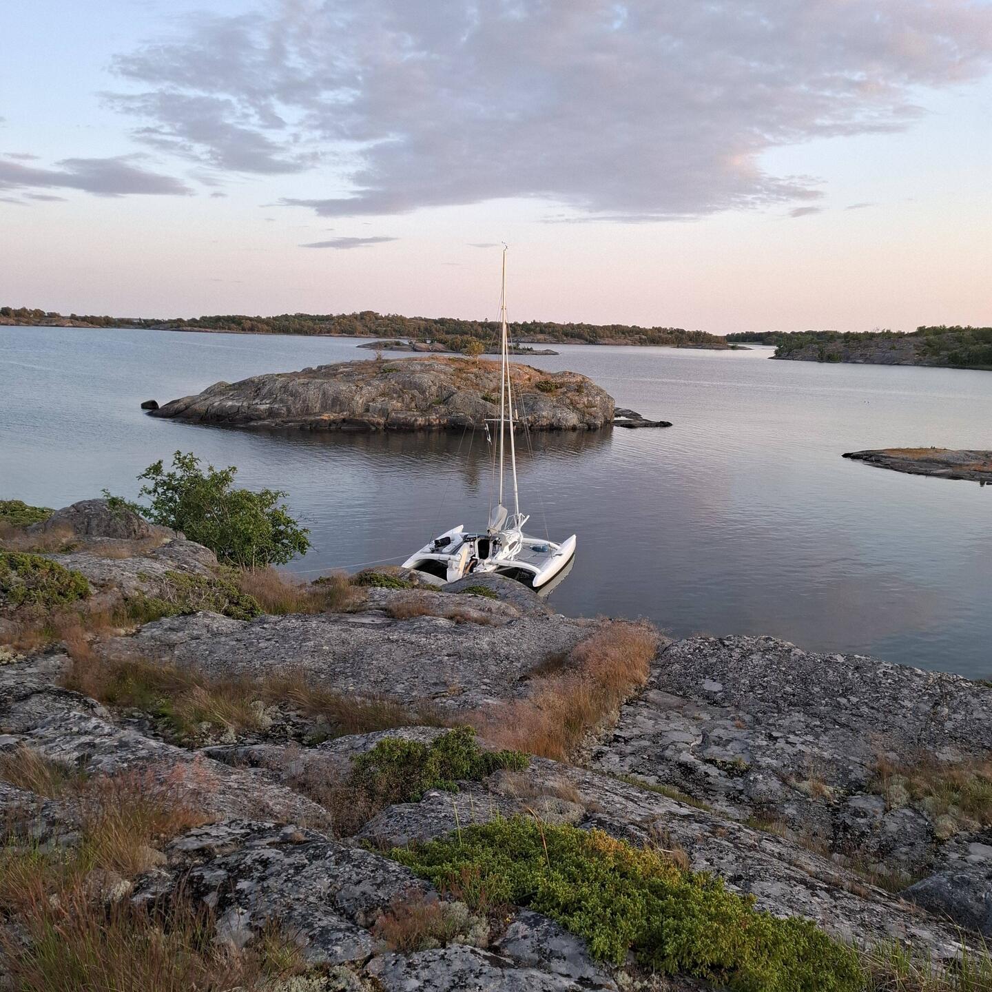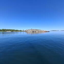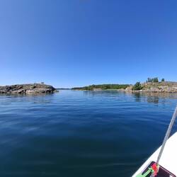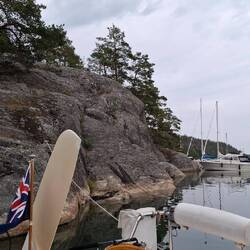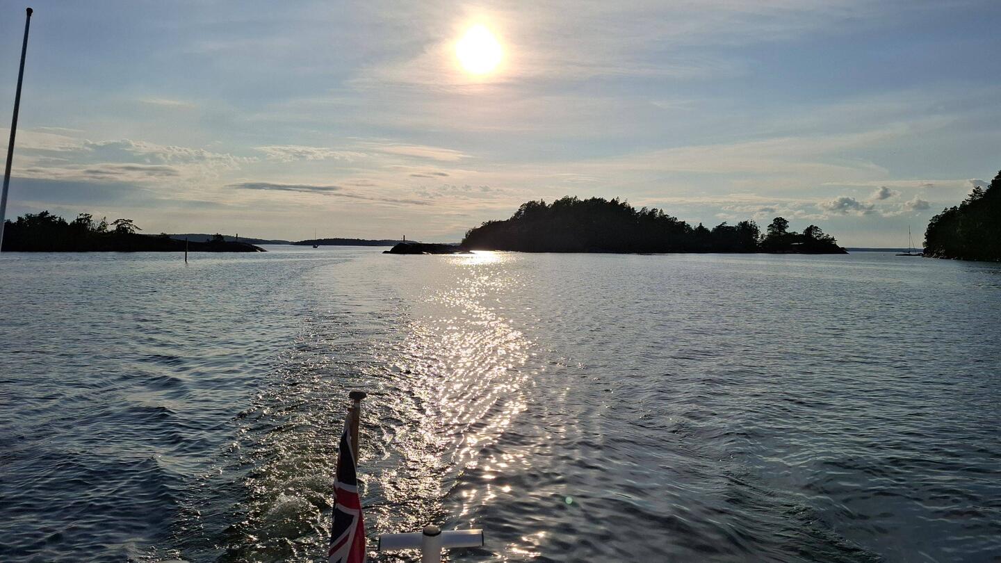 We left Sottunga about midday in beautiful calm waters and the sunniest of days. We had decided on a short stop to explore the archipelago. This inlet worked as a perfect anchorage and lunch base. Relaxation! Waters still enough to get the paints out for watercolour sketching. We whiled away the hours and decided an overnight here would be great and wanting to use the rock wedges and rings this was a chance to tie up to a rock in this perfect setting with amazing weather. Stunning views from the top of the rocks - watching the sunset at 22:58hrs - magical. Czytaj więcej