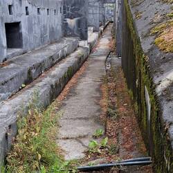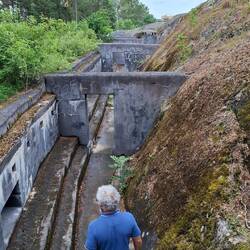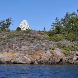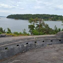 This was a completely spontaneous stop. We were enjoying meandering through the skerries, and in passing close by, Ron spotted military guns, so we decided to go and investigate. What seemingly felt like just another high rocky island as we tied up on the pontoon, revealed, just a short walk hidden behind the trees, the Siaröfortet. Blasted out of the massive rocks and then cemented over and camouflaged by appearing to look like the smooth archipelago rock. What a discovery! We were able to go under /into the fort and explore more with our hard hats - mine on my head , Ronneys in his hand ! It was extremely damp and leaky, making it cold and eerie. The fort was vast and spanned the majority of the island. A warren of officers rooms, bunks, search lights , boilers, mess , washing and communal toilets! Outside the domed smooth structure with look outs, and trenches along the length of the fort and guns also camouflaged on top of the concrete structure.
