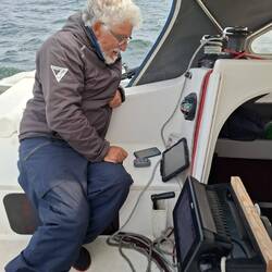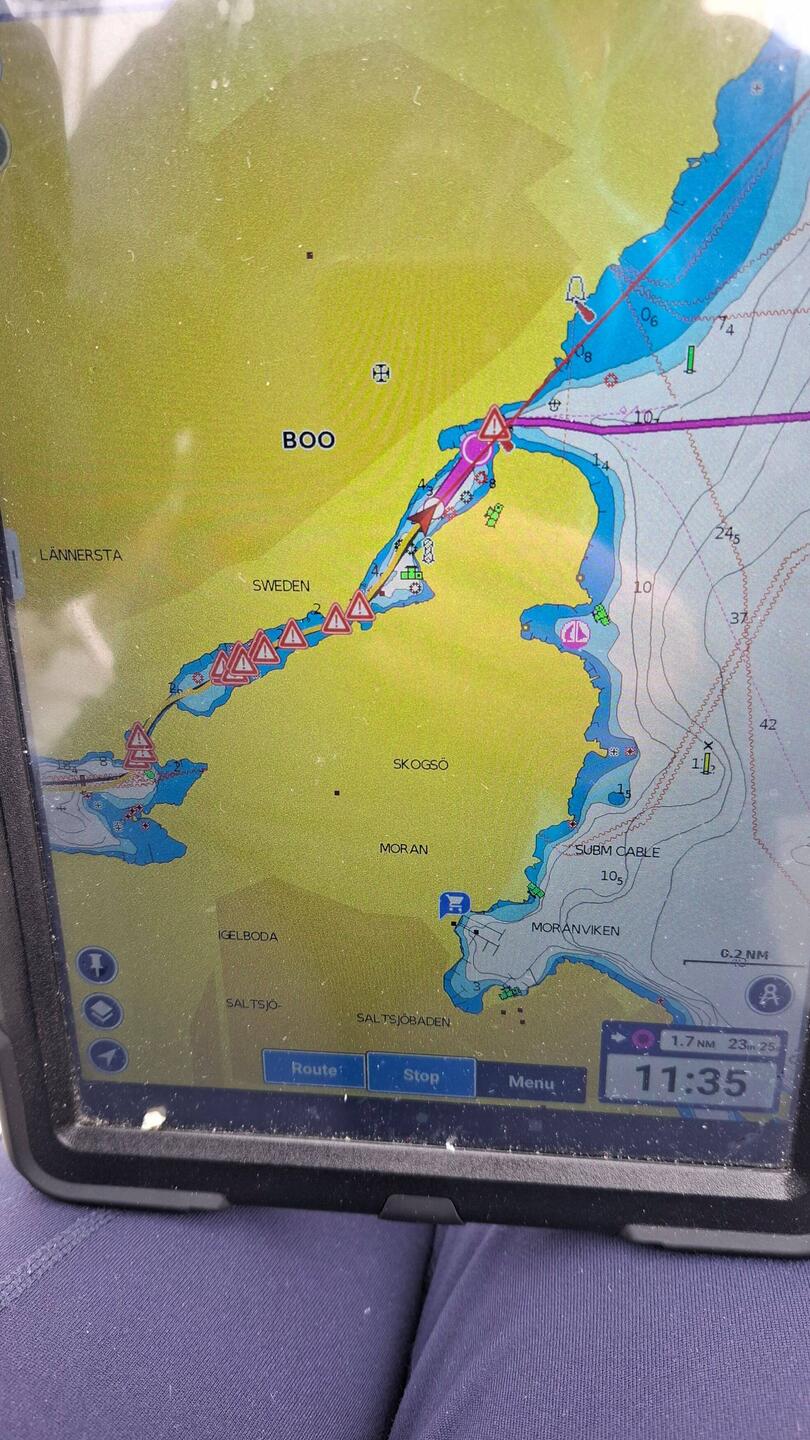 Arriving in the evening here due to the nasty rain storm that went through Karlby in the morning, which had most of us waiting for it to clear. The long motor sail was bright but cooler, which had me back in 3 coats whilst Ron had his 3 navigational friends Ray, Lennie & Sammy to help confirm the route through the outlying skerries in southern Äland.