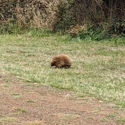 As I was a little bit confused about where the Alonnah Sheepwash Bay Track is starting. I stopped the car outside a public toilet and tried to figure it out. As I looked out of the left window I sa an Echidna walking out from a bush and over the grass. So I grabbed my phone and got out of the car as some motorcycles where passing on the many road. As I come around my car, the Echidna s gone. And I was just like: Oh no nat again.