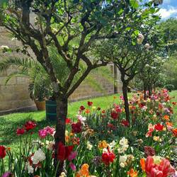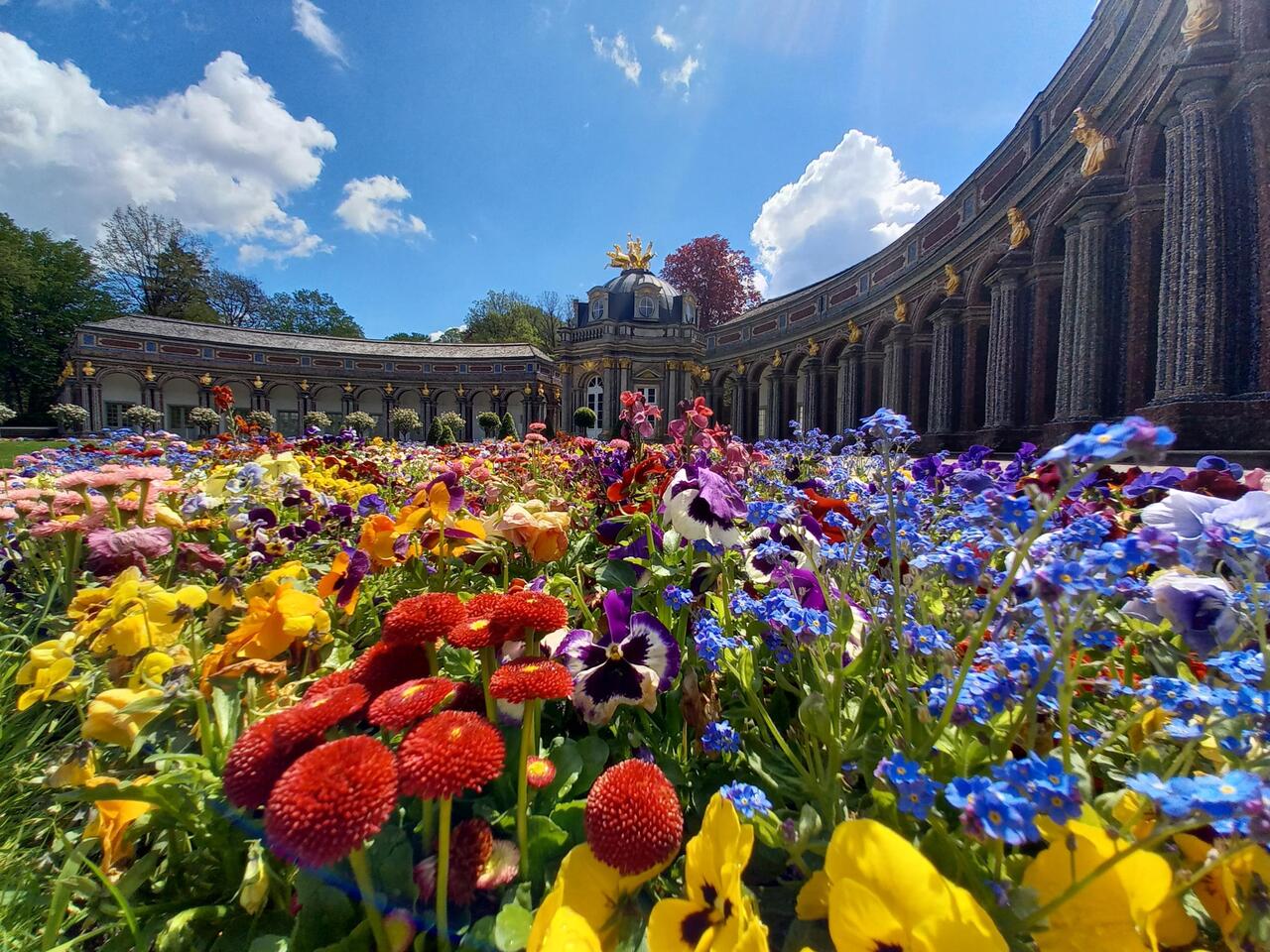 Wunderschön bunt der Blumenstreifen und der totale Kontrast zu den akurat geschnittenen Bäumchen im Hintergrund.👍😊