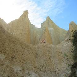 Als letzten Stopp waren die Clay Cliffs geplant, bei denen es sich um sehr helle Steinformationen, die aus sehr porösem Gestein bestehen und wie Säulen meterhoch in die Luft ragen, handelt. Um ein tolles Bild vor oder besser auf diesen Felsen zu bekommen, bin ich hier einen einigen Meter hohen Geröllhaufen hochgeklettert, was ganz gut geklappt hat, Papa konnte auch ein paar gute Fotos schießen. Beim Runterklettern bin ich allerdings abgerutscht und ein paar Meter runtergefallen. Glücklicherweise ist nichts passiert außer ein paar Schürfwunden. Was man nicht alles für Bilder macht...