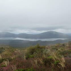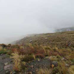 Die "Ferne-Planeten"-Landschaft hielt noch eine ganze Weile an, bevor sie sich plötzlich in eine lila-gelbe Heidenlandschaft verändert hat. Hier hätte man wohl eine kilometerweite Sicht über den Tongariro Nationalpark haben können, wir befanden uns aber immer noch in der Wolke, sodass alles etwas gespenstig wirkte.