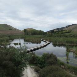 In der Zwischenzeit hatte sich das Wetter wieder gebessert, sodass wir noch einen Abstecher zu den Pekapeka Wetlands gemacht haben. Auf einem Steg kann man hier durch das Sumpfgebiet laufen und zahlreiche Vögel, insbesondere schwarze Schwäne mit ihren Nachkommen beobachten.