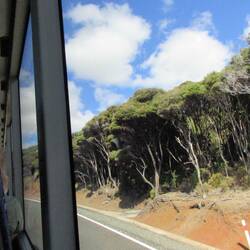 Mit einer Bustour ging es für mich heute ins Northland, dem nördlichsten Zipfel Neuseelands. Obwohl damit eine recht lange Fahrt verbunden war, war sie alles andere als langweilig. Da wir recht früh gestartet sind, führte der erste Teil der Strecke durch hüglige Farmlandschaft, die komplett in Morgennebel eingehüllt war, sodass sie sehr verwunschen aussah. Nach einer kleinen Wanderung durch einen Kauri-Wald, veränderte sich die Landschaft langsam immer mehr. Häuser waren kaum mehr zu sehen, schließlich sind wir an der nördlichsten Farm vorbeigefahren und da wir nun die subtropische Klimazone erreicht haben, wechselte die sonst sehr grünen Hügel zu einer Art bewaldeten Steppenlandschaft.